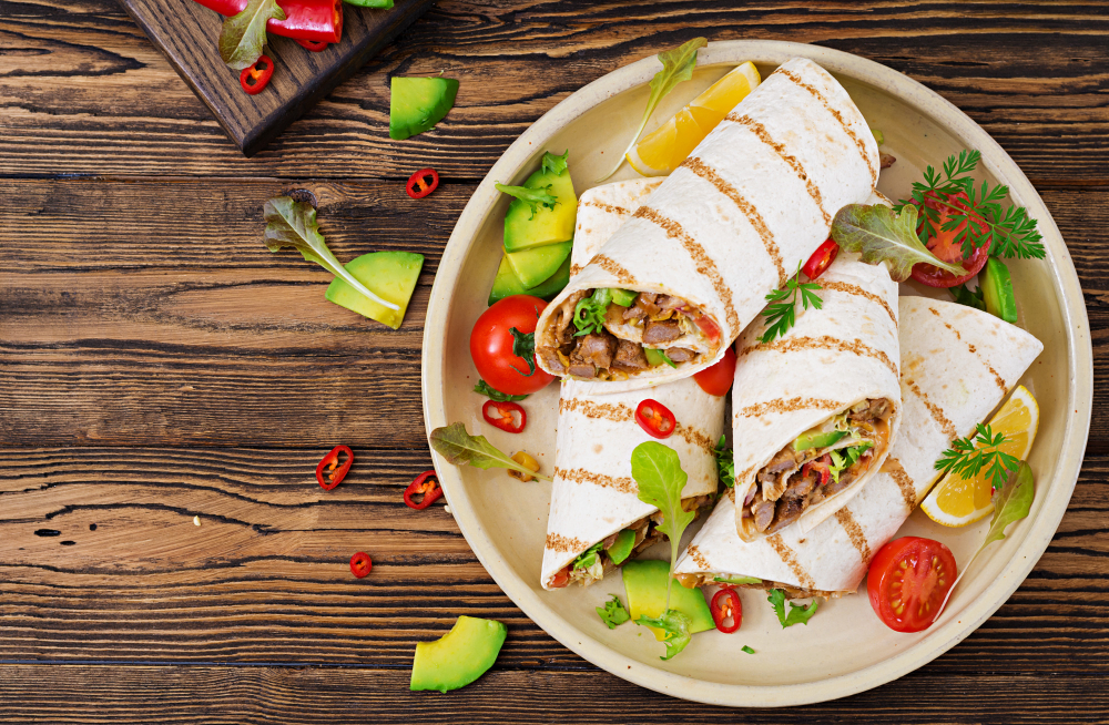 tortillia, beef steak, sour cream 50gr, cheese , paprika , lettuce, zucchini , french fries – 300gr